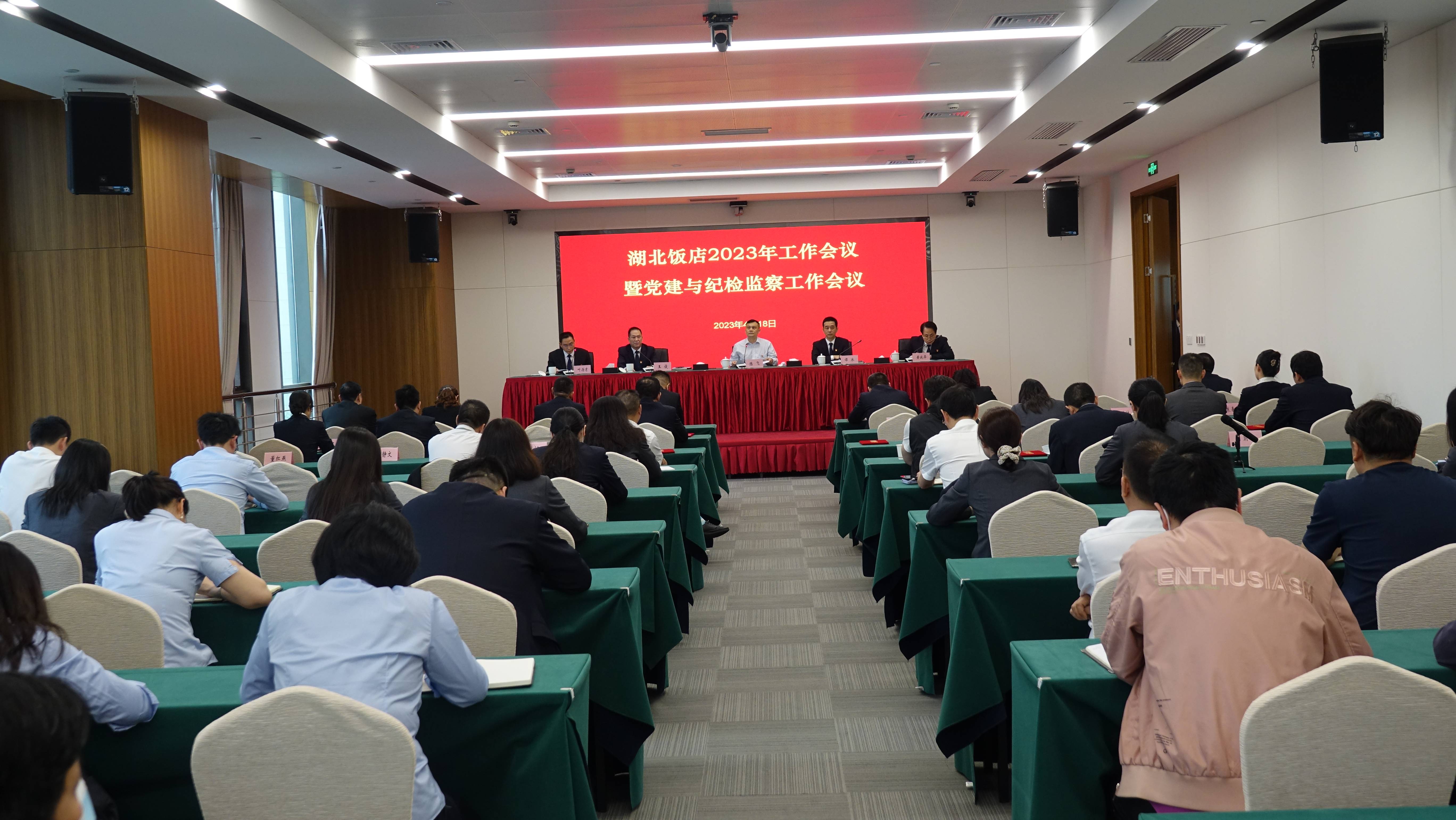 4月18日,湖北飯店召開2023年工作會議暨黨建與紀檢監(jiān)察工作會議。黨委書記、董事長陳飛作2023年黨建工作報告,黨委副書記、總經理譚冰作2023年工作報告,黨委委員、紀委書記王俊作2023年紀檢監(jiān)察工作報告,黨委委員、副總經理黃誠華宣讀飯店表彰決定,黨委委員、總會計師葉歷才主持會議。飯店本部及各子公司在崗員工100余人參加會議。