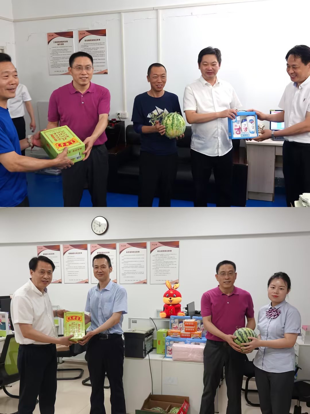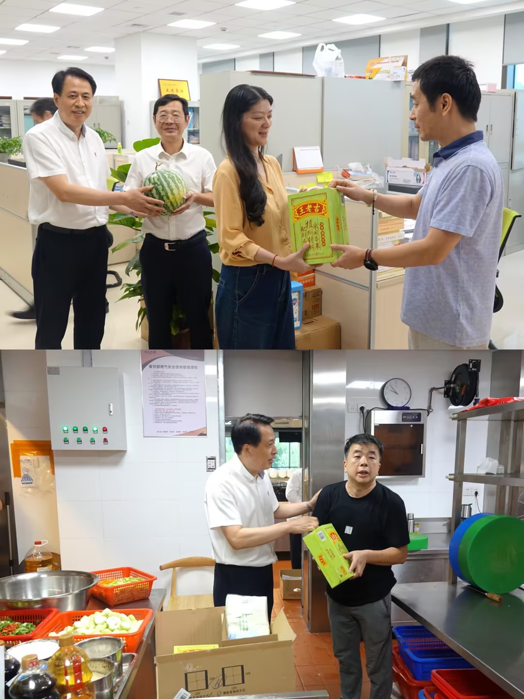 飯店領(lǐng)導(dǎo)一行首先前往生產(chǎn)經(jīng)營一線為在崗職工送去了王老吉、西瓜等防暑降溫物資,飯店領(lǐng)導(dǎo)心系職工的身心健康和安全,極大地激發(fā)了職工們愛崗敬業(yè)的工作熱情,進(jìn)一步增強(qiáng)了廣大職工的凝聚力和向心力。