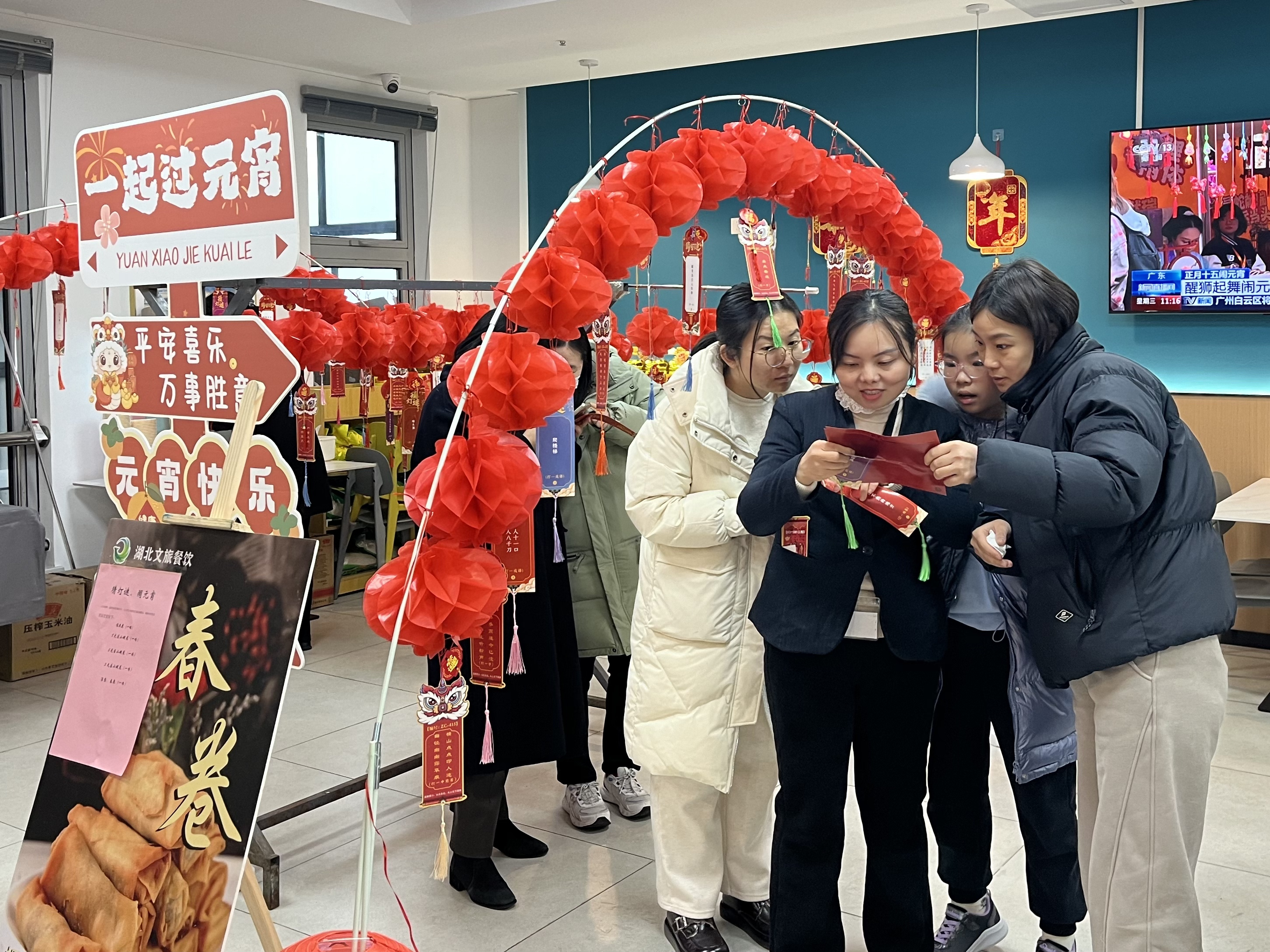 食堂內(nèi)懸掛著各式各樣的燈籠與氛圍裝置,五彩繽紛,節(jié)日氛圍瞬間拉滿。猜燈謎區(qū)域人頭攢動,大家興致勃勃地猜著燈謎,有的凝神思考,有的互相討論,現(xiàn)場歡聲笑語不斷。猜中燈謎的員工還獲得了食堂精心準(zhǔn)備的獎品,喜悅之情溢于言表。